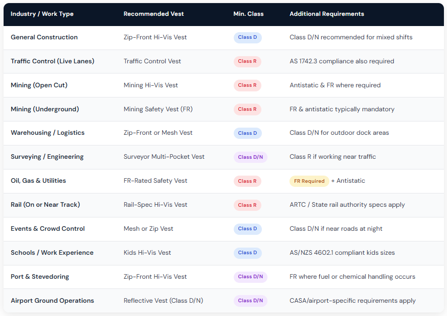 The table below provides a practical reference guide for the minimum compliance class required across common Australian industries. Note that individual projects, principal contractors, mining companies and government contracts may specify requirements above the minimum — always check site-specific safety management plans.